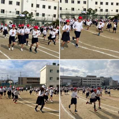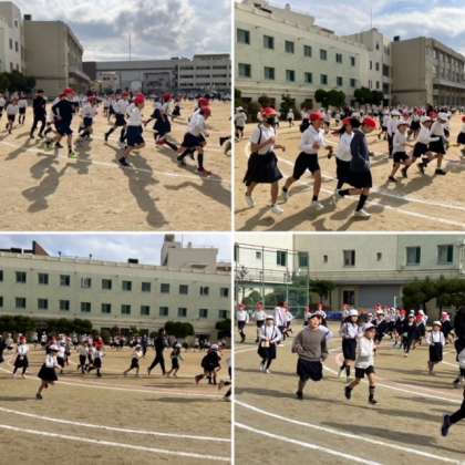今週と来週はかけ足週間のため、15分休みはみんなでかけ足をしています。今日は1年3年5年のグループがかけ足をしました。1年が内側、3年が中側、5年が外側というように、学年に合わせてコースが設定されています。