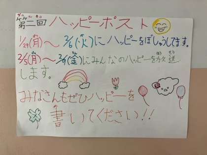 今週から来週にかけて、「ハッピーポスト」を実施しています。「ハッピーポスト」というのは、学校で起こったハッピーなことや楽しかったことを紙に書いてハッピーポストに入れるという取り組みです。運営委員会が中心になって取り組みをしてくれています。