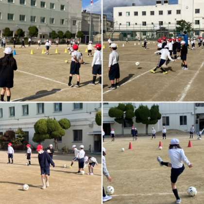 かっこよく蹴っている子もいますが、なかなかコーンに命中しません。いろんなところにボールが行くので、ボールを取りにあっちこっちと忙しく動いていました。体が温まりますね。みんな楽しそうに取り組んでいました。