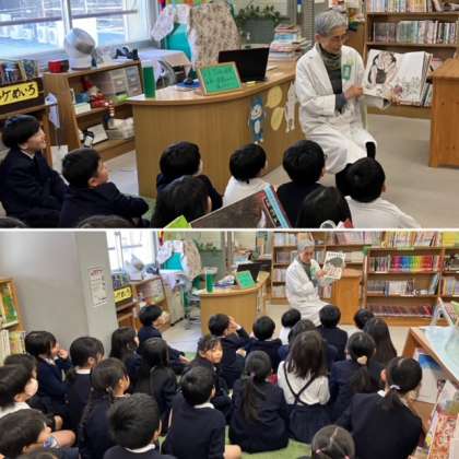 2年生の図書の時間です。最初に主幹学校司書の先生による絵本の読み聞かせがあります。今日の絵本は「へっこきどっこい」という絵本です。おもしろいお話で、みんな絵本の世界に引き込まれています。