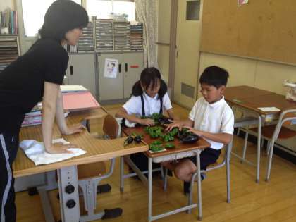 おたのしみの時間が少なくなったのですが、3時間目に、みんなで世話をし、収穫したなすびとピーマンをなかよく分け合いました。