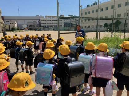 集団下校をするため集合している1年生にセイフティ淀川さんからのお話がありました。