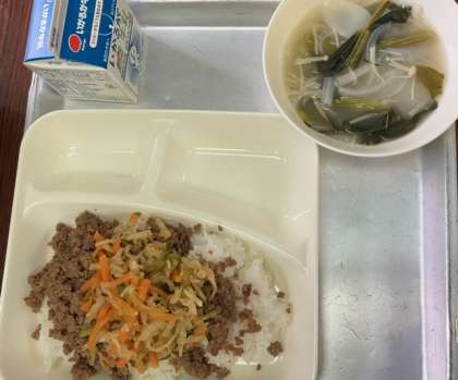 今日の給食の献立は、ビビンバ、トック、牛乳です。