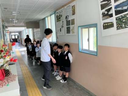 1年生が校内見学をしています。今までは教室、講堂、運動場ぐらいしか行ってなかったのですが、今日はいろいろなところを見学します。学校ってとても広いところですね。迷子にならないようにね!