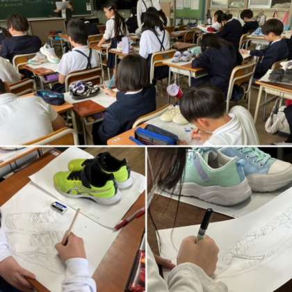 2組は図工です。自分の靴をスケッチしています。細かいところまでよくかけています。みんないい靴持ってるね。