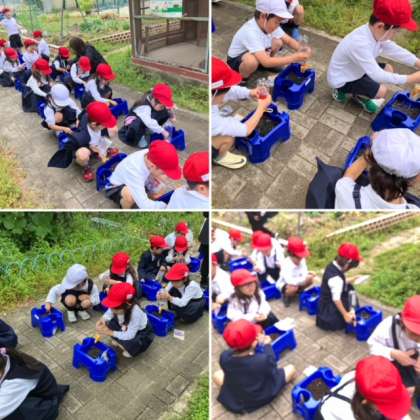 スッキリとしない空模様ですが、1年生は校庭でアサガオの種まきをしました。まず、植木鉢に小さなスコップで、土を入れます。そして、先生の説明をよく聞いて、「大きく育ってね」と願いを込めて、小さな種をまきました。肥料を入れて、水をあげて種まきは完了です。