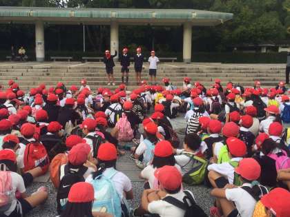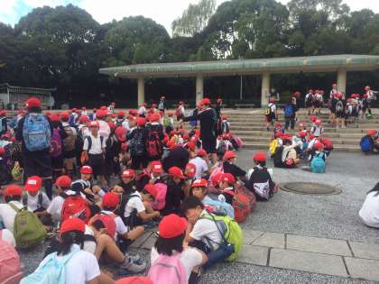 服部緑地公園の入り口付近でオープニングです。児童会代表から、めあてや注意事項の確認がありました。さあ、グループごとに出発!!