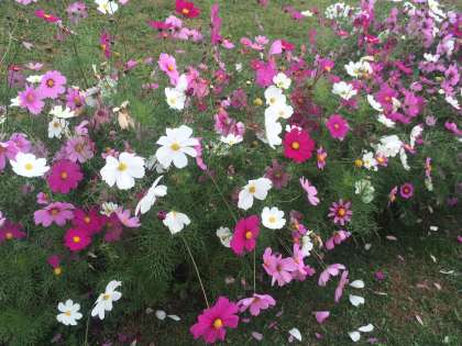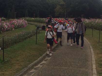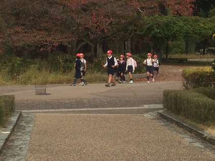 歩け、歩け!ポイントめざして!!コスモスの花がゆれて、とってもきれいです。落ち葉やどんぐりを拾う子も。生活科の学習で使ったり、休んだ友達にプレゼントしたりするのだそうです。