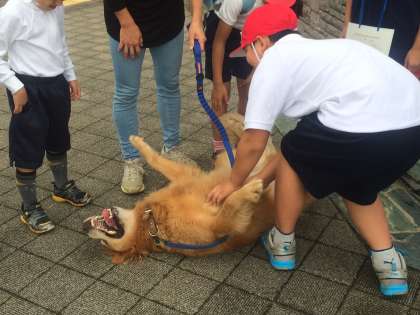 「いやーん、ダメだってば!」途中出会った散歩中のワンちゃん。ふれ合っちゃいました!「どこの小学校?みんななかがいいね!」と言ってくださり、さらにワンちゃんに大サービスです!!^_^