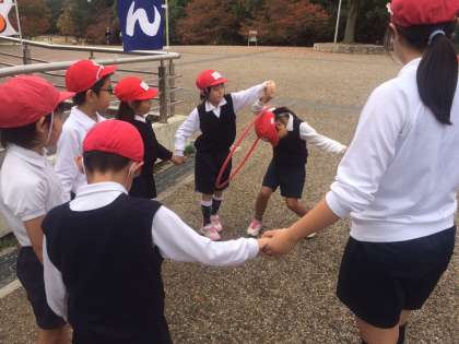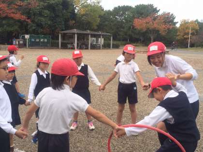 みんなで手をつなぎ、フラフープを回していくゲームのポイントです。「がんばって!」「もうちょっとだよ」などのやさしい言葉が飛び交います。