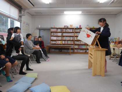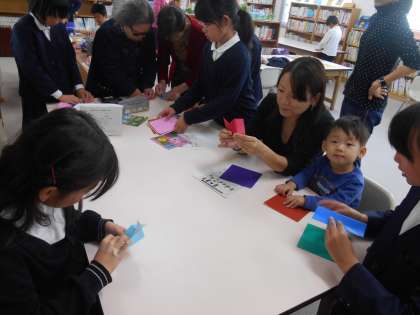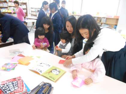 図書員会児童が地域の未就学の子どもたちを図書室に招待して、絵本の読み聞かせをしています。この取り組みは、平成18年度からスタートし、毎年行っています。今日は、4人の子どもたちが来てくれて、大型絵本「ひつじぱん」と「しりとりのだいすきなおうさま」の読み聞かせをしました。その後は、折り紙を一緒に折って帰るときはメダルをプレゼントしました。やさしいお兄さん、お姉さんの頼もしい姿がたくさん見られました。また来年も遊びにきてくださいね!