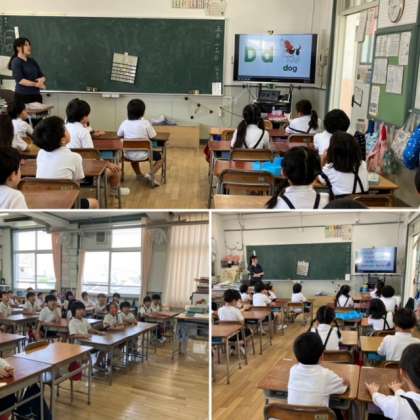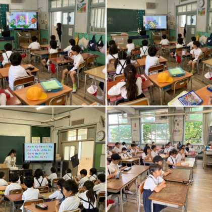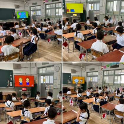 1年生と2年生は授業として英語の学習はありませんが、朝の英語タイムで歌を歌ったり、体を動かしたりして、楽しく英語の学習をしています。みんな笑顔で英語の活動に取り組んでいました。