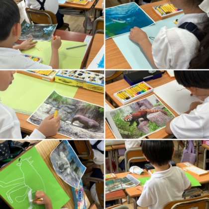 今日はそのお気に入りの動物の画像を印刷したものを見ながら、動物の絵を描きました。キリン、ペンギン、オオカミ、レッサーパンダなど、みんなそれぞれお気に入りの動物は違うようです。みんなかわいく動物をかけていますね。