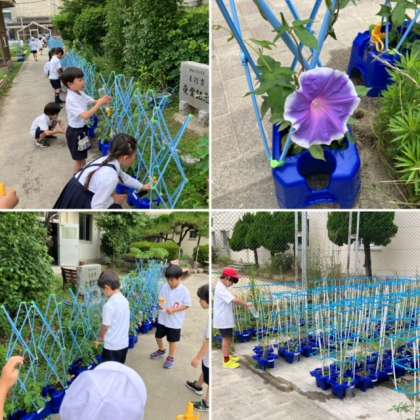 校庭では、1年生のアサガオ、2年生のミニトマト、3年生のマリーゴールド、なかよし学級のサツマイモなど、すくすくと育っています。アサガオの花もちらほらと咲いてきていますね。