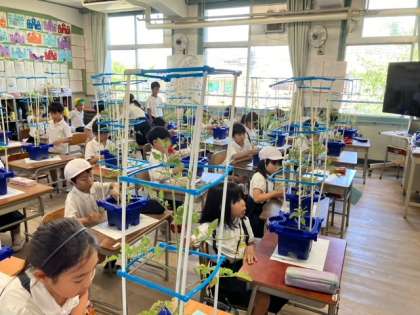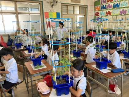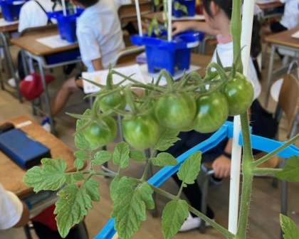 2年生が育てているミニトマトが大きく育ってきました。本来ならば外でミニトマトの観察をするのですが、今日は熱中症を警戒しないといけないレベルの暑さとなってきたので、教室に鉢を持ち込んで観察をしています。