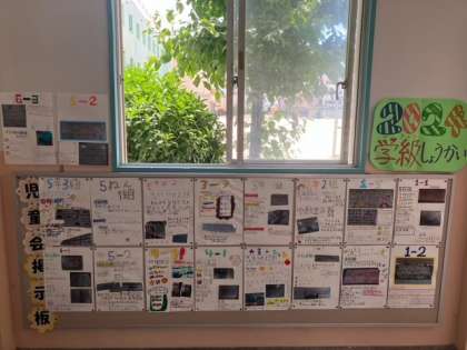 それぞれのクラスの学級目標、好きな遊びや給食のランキングなど、それぞれの学級の様子がよくわかります。