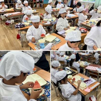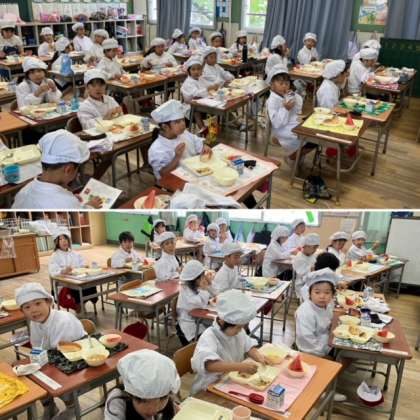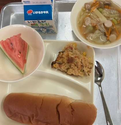 子どもたちの大好きな食べ物がたくさんある献立ですが、夏といえばスイカです。とても甘いスイカを子どもたちは美味しそうに食べていました。