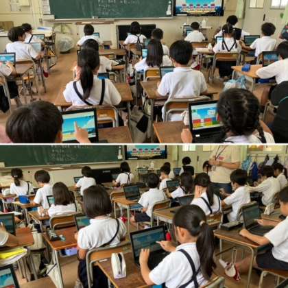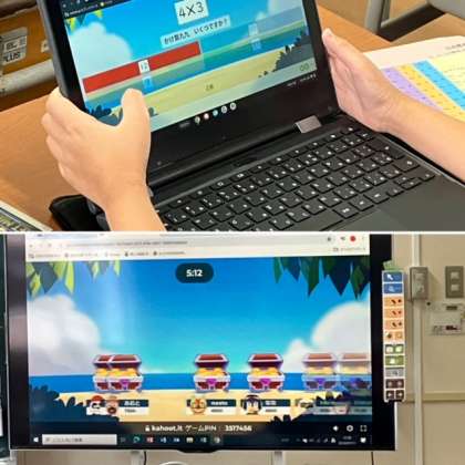 3年生の教室では、タブレットを使って計算練習をしています。ゲーム感覚で楽しみながらの学習です。みんなで楽しく競い合いながら取り組んでいました。すごい集中力です。