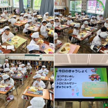 1年生の教室では、「給食の献立で一番美味しい!」と言っていた子がいました。1年生の子どもたちもたくさん給食を食べるようになりましたね。2学期の給食も楽しみにしていてください。