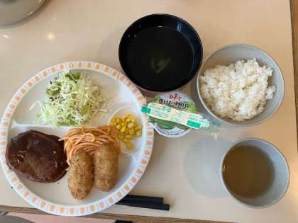 1日目の夕食の時間になりました。ハンバーグなど、子どもたちの好きそうなおかずの夕食です。