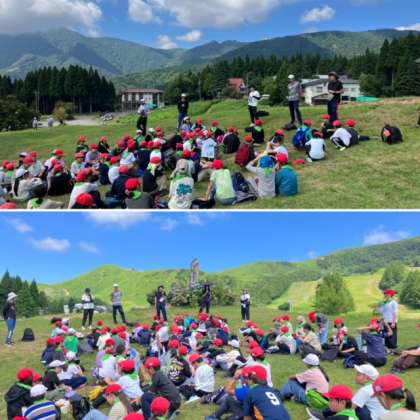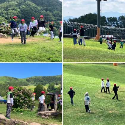 冬にはスキー場になる緩やかな斜面の高原で、クラス写真を撮影した後、鬼ごっこをしたり、斜面を転がったり、虫取りをしたりして楽しく遊びました。