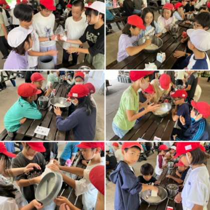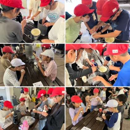 子どもたちは活動班で力を合わせてクリームを混ぜたり、円柱形の入れ物を転がしたりしました。みんなとても楽しそうで、一緒に行動を共にしている活動班はとても仲良くなっています。