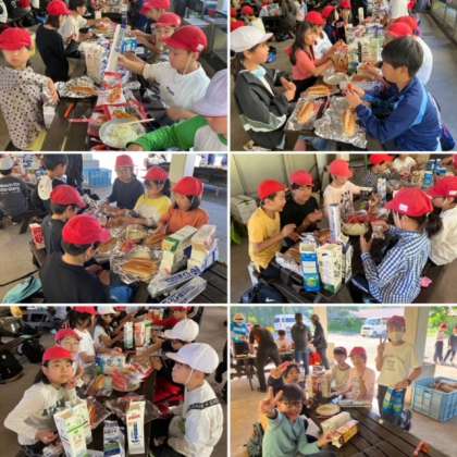 出来上がると、活動班でジュースで乾杯して、美味しいホットドッグを食べました。焼きたてホカホカのホットドッグはとても美味しいですね。