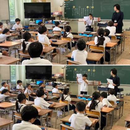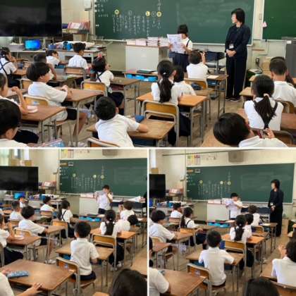 2年生の教室では「夏休み大発見」ということで、夏休みに出会った素敵な体験を一人一人が発表をしていました。夏休みにキャンプに出かけた時に見つけた昆虫や水族館で見た魚、公園に出かけた時に見かけた動物など、また、お家で家族と一緒にもの作りをして発見したことなど、楽しい夏の思い出の発表でした。発表した後のみんなの拍手がとても温かい雰囲気でした。