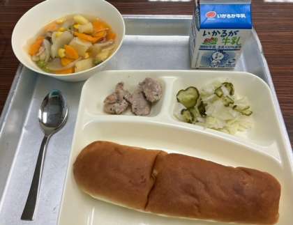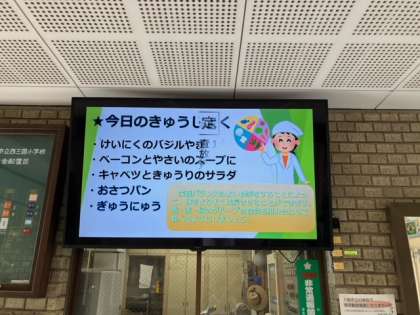 玄関を入ったところに設置しているモニターに、今日の予定やメッセージを映しています。毎朝登校して子どもたちが必ず見ているのが、今日の給食です。今日も「おさつパンだー!」と喜んでいる子がいました。