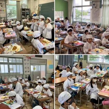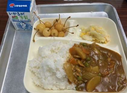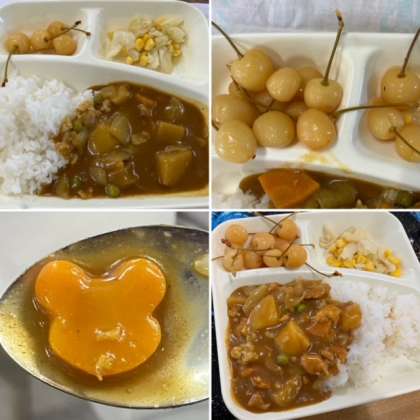 今日は子どもたちが大好きなカレーライスです。たくさんの子どもたちが「おふやし」をして、大盛りカレーライスです。さくらんぼをたくさん食べている子もいますね。