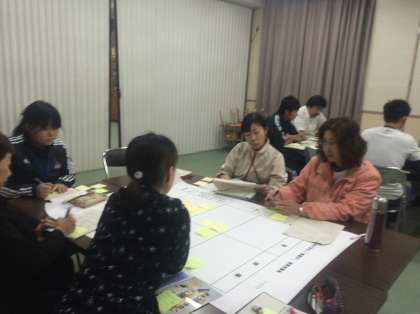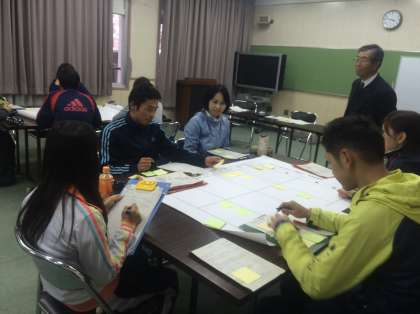 研究授業の後、いつものように研究討議会を行いました。今回の1年生の授業がスムーズにすすんだのは、先月の2年生の「タグ取り宝運び」の実践があったからで、系統立てた指導の必要性を改めて実感しました。活発な討議も会を重ねる毎に深まっていっています。教育センターのI先生に続けてご指導いただいている事も成果の要因で、大変ありがたいです。研究授業で学んだことを日々の体育の授業に活かしていきます。