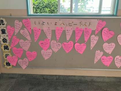 先週「校内でのうれしかったことや楽しかったこと」を書いてポストに入れる「ハッピーポスト」を実施しました。今週の給食の時間に、運営委員の子どもたちが「運営委員会ラジオ」として「ハッピーポスト」の内容を放送します。