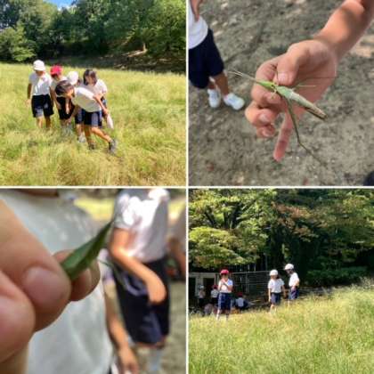 芝生でバッタを捕まえたら、ドングリを拾ったり、そして滑り台の途中の遊具で遊ぶこともできます。