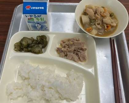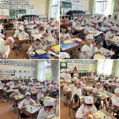 今日の給食は「ねぎじょうゆ焼き」や「赤じそあえ」といった少し珍しい味付けのおかずでした。3年生の子どもたちは、けっこう気に入ってたくさんおかわりをしていました。
