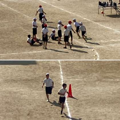 運動場で6年生がリレーの練習をしていました。バトンが上手くつながるように、練習をがんばってくださいね。