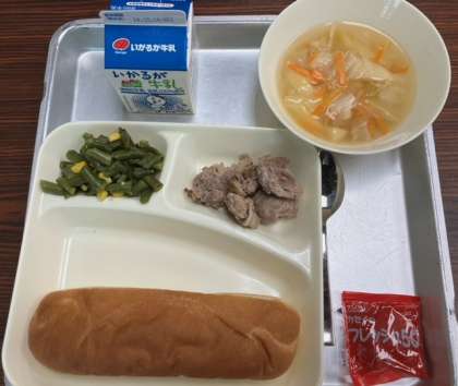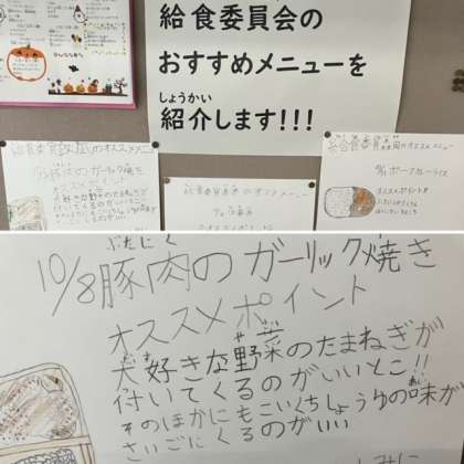 「豚肉のガーリック焼き」は、職員室前に掲示されている「給食委員会のおすすめメニュー」の1つになっています。