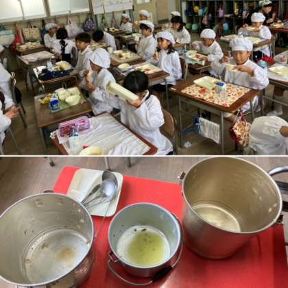 美味しい給食で、2年生のクラスの食缶は空っぽです。みんなよく食べて、元気いっぱいです。