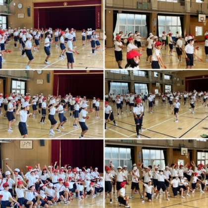 2時間続きの体育で、運動場と講堂を使って練習をしています。今日の2時間目は、運動場で2年生、講堂で4年生が練習をしていました。