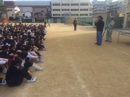 子どもたちは、担任誘導のもと避難し、身を潜めて待機しました。その後運動場に集合してセーフティ淀川の方、淀川警察署のおまわりさんの話を聞きました。学校の中に不審者が入った時は、私達教職員は全力で子どもたちを守ります!大人がいない時などはどうしたらよいか自分で考えて動くことができるようになって欲しいと願っています。そのためにもこれから繰り返し訓練を行っていきます。この後、地区別に分かれ、班ごとに下校しました。