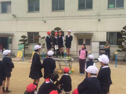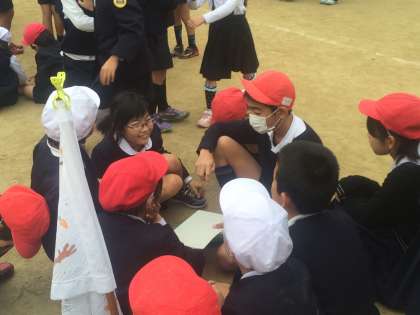 「ステレオゲーム」をしました。4人の集会委員会の担当が、朝礼台で一文字ずつ言ってつなげた言葉をあてます。縦割り班で相談しています。今日のテーマは野菜でした。なかなか、難しくて聞き取りにくい言葉もありましたが、協力して答えを出していました。