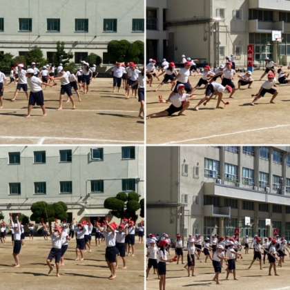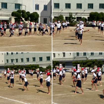 元気な4年生にはピッタリなソーラン節です。隊形移動がたくさんあり、なかなか難しい演技だと思います。鳴子の音やかけ声で迫力ある演技に仕上げでいこうとみんなでがんばっています。今日は、はだしで演技をするのがまだ慣れていない様子でしたが、今週の練習で慣れていってくださいね。