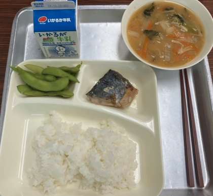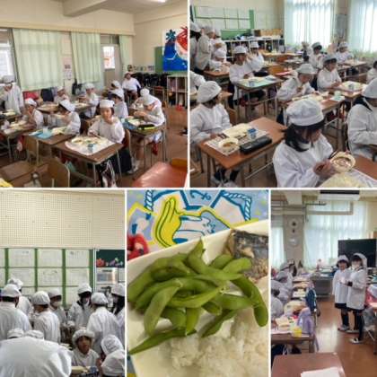 4年生の教室では、給食当番さんがしっかり役割を果たしてがんばっています。枝豆は人気で山盛りの子もいました。さごしもしっかり食べてくださいね。美味しいですよ!