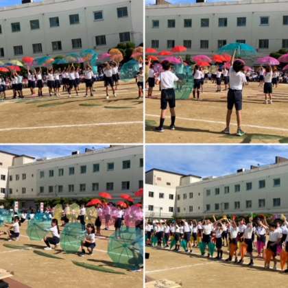 まず、トップバッターは3年生でした。3年生はカラフルなカサを使ったダンスです。ワクワクさせられる入場で始まり、カサをくるくる回したり順番に動いたりするところや流れるような隊形移動は、練習の成果を感じる演技でした。最後の歌を歌いながらの退場は、演技の余韻を感じることができ、感動しました。なないろのカサが太陽の光でキラキラと輝き、運動場はカラフルな花が咲いたような素敵な演技でした。