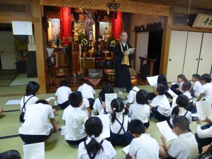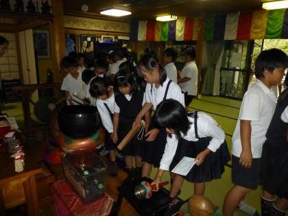 自敬寺は、江戸時代末期(約300年前)に建てられ、現在の住職である服部さんが16代目になるそうです。そして、服部さんは、西三国小学校の第3期生で、子どもたちの大先輩であることが分かりました。