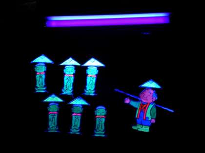 鈴虫については、2年生のみんなも7月と9月に飼育を体験させてもらっていたので、興味津々でお話を聞いていました。パネルシアターは、部屋を暗くして、ブラックライトに当たると光る蛍光塗料を使ったもので、子どもたちは大喜びでした。他にも、お寺にある木魚など、いろいろな道具を見せていただき、実際に触らせてもらいました。
