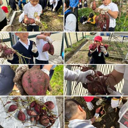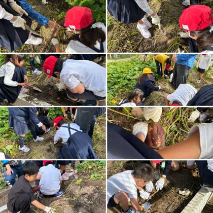 よく育ったさつまいも、掘っていくと、大きなおいもさんがたくさん出てきます。「デカい!」「すごい!」驚きの声、感動の声が思わず出てきます。みんなで力を合わせて、たくさんのおいもさんが収穫できました。また後日、このおいもさんを使って「おいもパーティ」をする予定です。