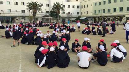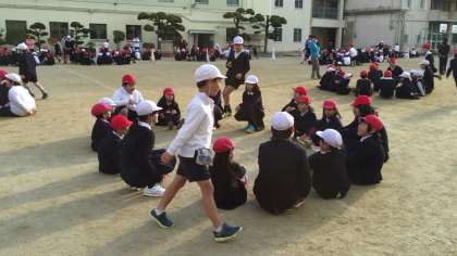ハンカチ落としをしました。今日はハンカチの代わりに運動会で使う紅白玉を使いました。縦割り班全員が楽しめるように、高学年のやさしい声かけがありました。