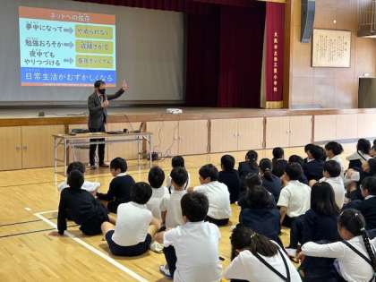 5年生と6年生を対象に、KDDI株式会社から来ていただいてスマホ安全教室を行いました。