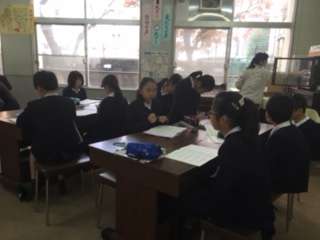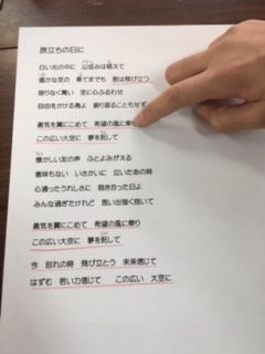 同じ時間、音楽の授業を担任が交代して行っています。「旅立ちの日に」を初めて聴きました。歌詞で気に入ったところに線をひいています。