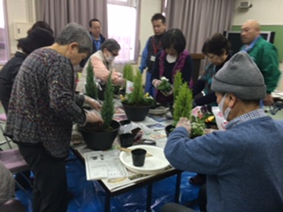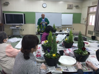 バランスよく、見栄えのするように植えるためのコツを教えていただきました。植え終わった後、手入れの仕方、肥料や水やりの注意など細かいところまでアドバイスをいただきました。クリスマス、お正月と花があるとうれしいですね。学校の玄関に一鉢置いています。